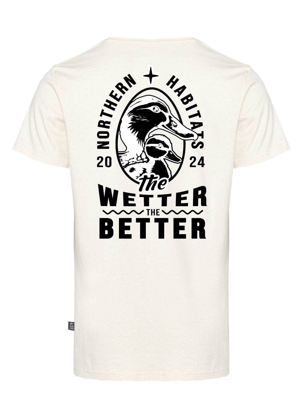 Paidan rintamukseen on painettu Suomen Riistanhoito-Säätiön logo ja paidan selkään Asmo Raimoahon kuvittama tyylikäs Northern Habitats – The Wetter the Better – grafiikka.